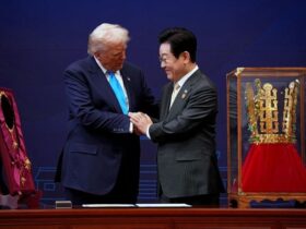 トランプ大統領は韓国到着後、慶州国立博物館で、韓国の李在明大統領から新羅時代の「金の冠」の複製と、韓国最高の勲章を授与。