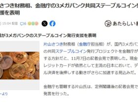 片山さつき財務相(金融庁担当相)が、国内3メガバンクの共同ステーブルコイン発行プロジェクトを金融庁が支援する方針だと表明しました。