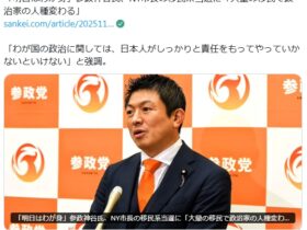 参政党の神谷宗幣代表は、ニューヨーク市長選でイスラム教信者のゾーラン・マムダニ氏(34)が当選したことについて「大量に移民を入れ、多文化共生みたいなことをやっていくと、政治家の人種も変わっていくことの表れだ」と指摘。移民…