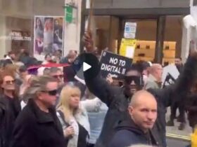 ロンドンでデジタルID制度反対デモ「NO TO DIGITAL ID」のプラカードを持った大規模な群衆。