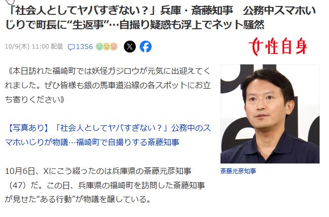 「社会人としてヤバすぎない?」兵庫・斎藤知事 公務中スマホいじりで町長に“生返事”…自撮り疑惑も浮上でネット騒然(女性自身)