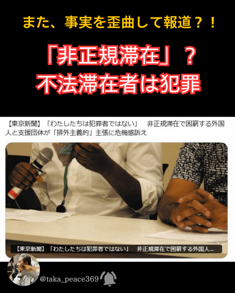 また、東京新聞が事実を歪曲「非正規滞在」?不法滞在