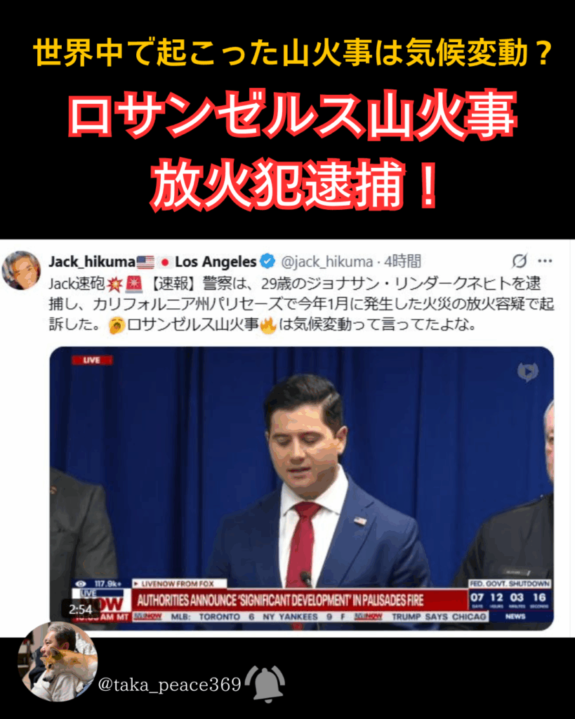 【速報】警察は、29歳のジョナサン・リンダークネヒトを逮捕し、カリフォルニア州パリセーズで今年1月に発生した火災の放火容疑で起訴しました。