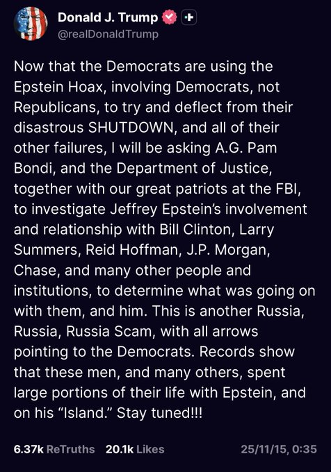 民主党が、共和党ではなく民主党員を巻き込んだエプスタインの捏造を利用して、破滅的な政府閉鎖やその他の失敗から目をそらそうとしている今、私はパム・ボンディ司法長官と司法省、そしてFBIの偉大な愛国者たちに、ジェフリー・エプスタインとビル・クリントン、ラリー・サマーズ、リード・ホフマン、JPモルガン、チェース、その他多くの人々や機関との関わりと関係を調査し、彼らとエプスタインに何が起こっていたのかを突き止めるよう要請します。