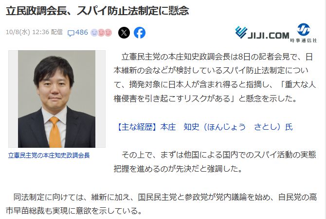 - 立民政調会長、「重大な人権侵害を引き起こすリスクがある」スパイ防止法制定に懸念 はコメントを受け付けていません