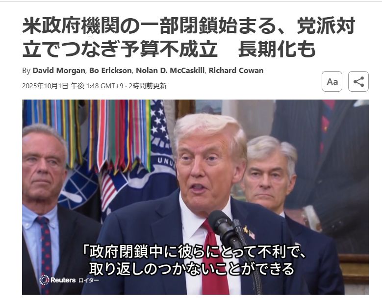- 米政府機関の一部閉鎖始まる、党派対立でつなぎ予算不成立