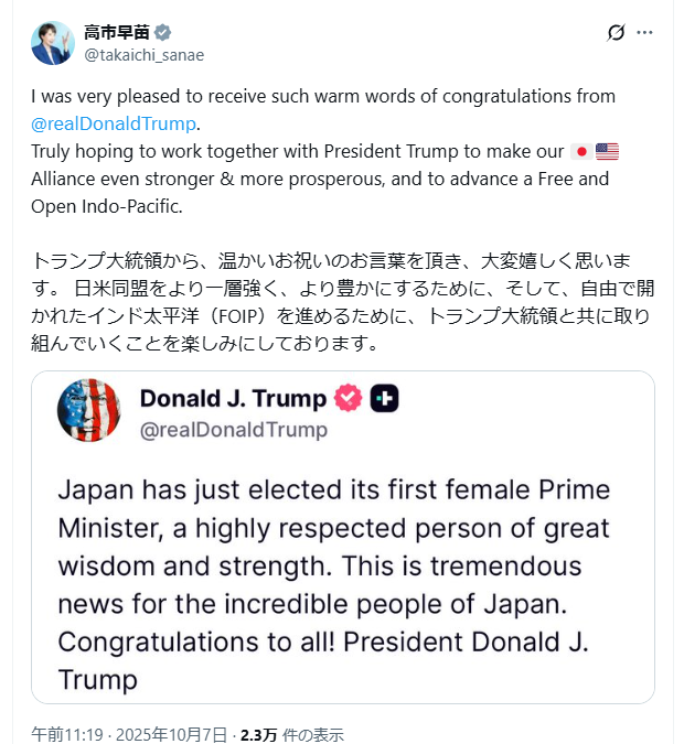 高市早苗新総裁「トランプ大統領から、温かいお祝いのお言葉を頂き、大変嬉しく思います。日米同盟をより一層強く、より豊かにするために、そして、自由で開かれたインド太平洋 (FOIP) を進めるために、トランプ大統領と共に取り組んでいくことを楽しみにしております。」